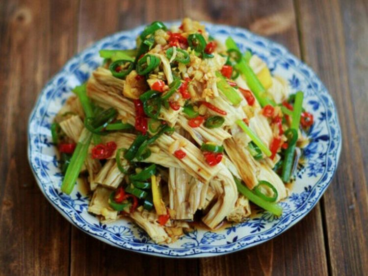 腐竹、小米椒、青尖椒、干辣椒、姜、蒜、生抽、耗油、盐、鸡精、香油、香芹。 做法: 1、腐竹用冷水或者温水提前泡发,泡到用手捏一下到没有硬心为止,然后切成差不多的长度,香芹也切成合适的长度备用。 2、小米椒、青尖椒、干辣椒、姜、蒜都切好备用。www.eeali.com 3、锅中注入清水烧至沸腾,放盐把腐竹在锅里煮3分钟左右捞出,再把香芹煮2分钟捞出,捞出都要滤干多余的水分哦。 4、取一个小碗,在里面放入生抽、耗油、盐、鸡精、香油。 5、热锅热油,放入小米椒、青尖椒、干辣椒、姜、蒜炒香。 6、把炒香的辣椒和调好的酱料一起倒在腐竹上面,搅拌均匀。 7、待其温度凉后,就可以享用啦。 ![]() | |
