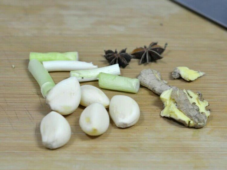 5、葱段、蒜瓣、八角备好,小黄姜拍扁即可。